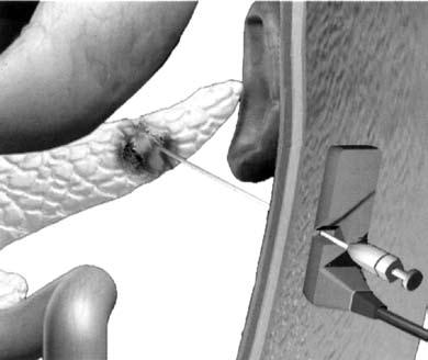Рис. 141. Тонкоигольная аспирационная биопсия поджелудочной железы под контролем УЗИ.
