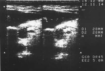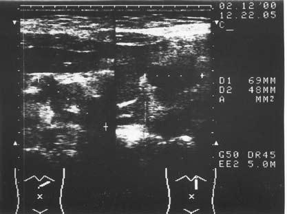 Рис. 143. Ультразвуковое исследование. Хронический псевдотуморозный панкреатит. На снимке видна гипоэхогенная бугристая «опухоль» головки ПЖ 3x3,5 см (1)