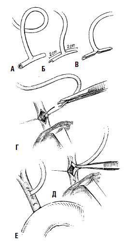 Рис. 146. Дренирование холедоха Т‑образным дренажем. На рисунках А‑В показано «выкраивание» дренажа; Г, Д – введение в холедох; Е – окончательный вид после ушивания холедохотомического отверстия