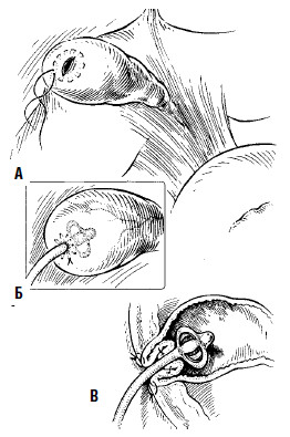 Рис. 147. Этапы формирования холецистостомы (А, Б, В)