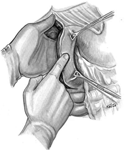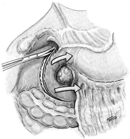 Рис. 149. Двенадцатиперстная кишка вместе с головкой поджелудочной железы тупо отслаивается от забрюшинной клетчатки и производится пальпация мобилизованных органов