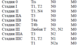 Группировка рака пищевода по стадиям.