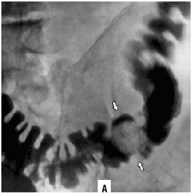 Б – стрелками указан участок циркулярного сужения просвета кишки