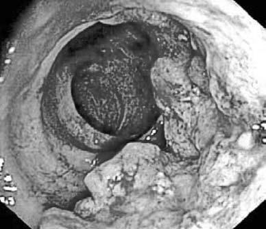 Эндоскопическая картина 3) неровности контура кишки, атипичного рельефа слизистой, обрыва складок и отсутствие гаустр в области поражения;