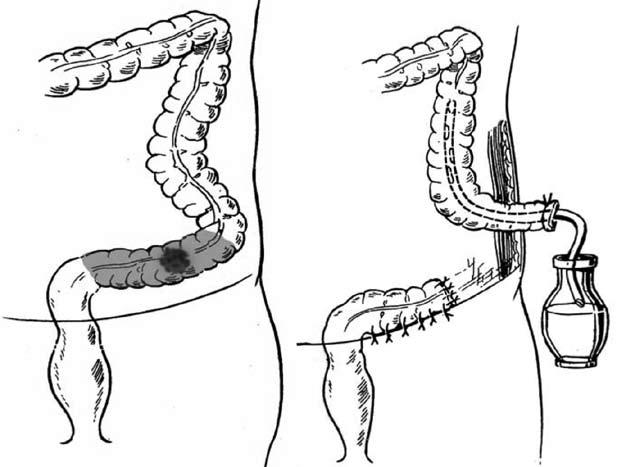 • Трехэтапные операции: операция Цейдлера‑Шлоффера (формирование колостомы (первый этап), резекция ободочной кишки с опухолью (второй этап), закрытие колостомы (третий этап).