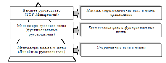 По длительности планового периода выделяют три уровня планирования (горизонты планирования), соответствующие трем иерархическим уровням менеджмента и, соответственно, трем уровням принятия решения (рис. 6.7):