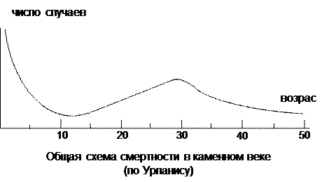 Распределение смертности в нижнем и среднем палеолите (по Б.Ц.Урланису)