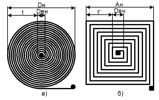 Поэтому тонкопленочные катушки обычно имеют на площади 1 см2 число витков не более 10 и выполняются в виде круглой или квадратной спирали (рисунок 7а,б). Индуктивность таких катушек определяют по формулам: