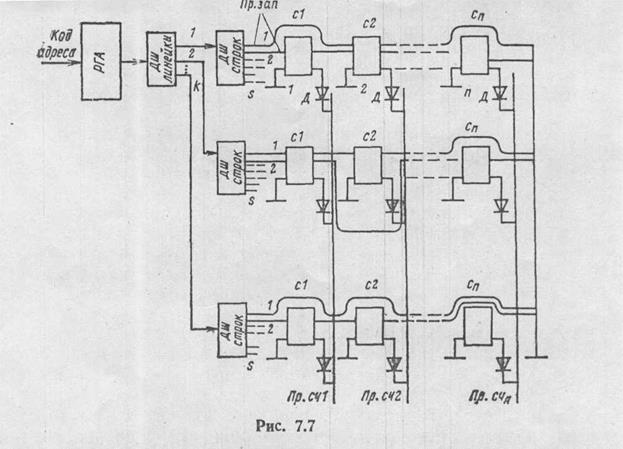 Код адреса поступает на ЗУ и должен указывать ту линейку и тот провод в линейке, для которого нужно считать записанное число. Для этого от регистра адреса (РГА) импульс тока поступает на дешифратор ДШ линейки (k линеек) и затем на дешифратор строки (s строк). В результате действия дешифратора сигнал запроса подается только на один провод из всей системы. На выходах проводов считывания Пр. сч1, Пр. сч2, количество которых равно количеству разрядов записанного числа, появятся сигналы при записи “1” или отсутствуют сигналы при записи “0”. Детекторы Д необходимы для того, чтобы обеспечивалось малое сопротивление прохождению считанного импульса с той линейки, в которой записано требуемое число, и имелось бы большое сопротивление для тока обратного направления. Это препятствует воздействию считанного импульса на другие линейки. Запись в такое устройство должна производиться при изготовлении ПЗУ. Всякая смена записи информации требует размонтажа ПЗУ и прошивания сердечников в другой последовательности. Это ограничивает применение ПЗУ на ферритовых сердечниках, хотя по удельным характеристикам (стоимости хранения одного бита, массе и габаритам на 1 бит) они несколько лучше, чем ОЗУ на ферритовых сердечниках. В настоящее время такие ПЗУ и ОЗУ применяются все меньше, но они имеют принципиальное преимущество перед другими ЗУ – устойчивы к действию радиации.