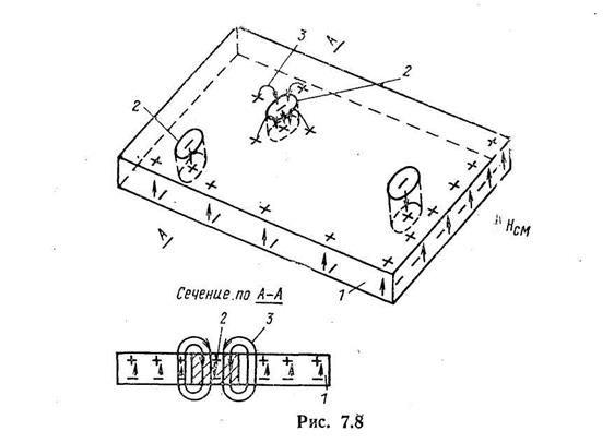 показано на рис. 7.12. Очевидно, что под влиянием неравномерного магнитного поля домен сместится к одному краю аппликации, где ее поле будет направлено против поля