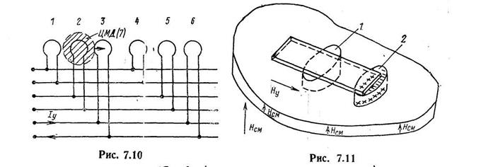 Как подчеркивалось выше, необходимо обеспечить движение многих доменов по линейке, длина которой значительно больше, чем размеры доменов с тем, чтобы они могли продвигаться на расстояние, превышающее их диаметр в тысячи раз. Для этого должна быть создана система аппликаций, образующих линейки на поверхности пленки. Существует много различных форм и видов аппликаций. Для пояснения сущности их действия остановимся только на одном варианте аппликаций, который изображен на рис. 7.13. Для того чтобы обеспечить перемещение доменов по линейке аппликаций, необходимо вращать внешнее магнитное поле НY так, как показано на рис. 7.13. Такого вращения можно добиться подачей токов, сдвинутых по фазе на 900, на две управляющие катушки. Известно, что при этом создается вращающееся магнитное поле с периодом вращения, равным периоду тока. В верхней части рис. 7.13 показаны линейка и начальные положения двух доменов – ЦМД1 и ЦМД2.