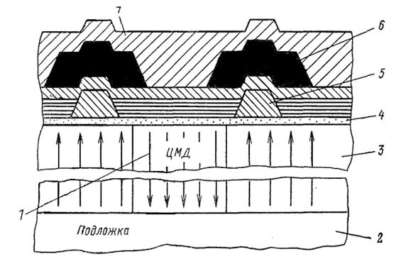 Конструкция ЗУ на ЦМД.Устройство такого ЗУ видно из рис. 7.18, где 1 — ЦМД (примерно 1,2·103 нм); 2 — немагнитная гранатовая подложка (примерно 1,5·103 нм); 3 — магнитная пленка (примерно 1,5·103 нм); 4 — слой двуокиси кремния