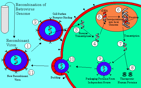 Ескерту. Қажетті гендері бар сусызданған РНҚ-вирустар (ретровирустар) ревертаза гендерімен бірге (сызбанұсқада – 1) клеткаға бағытталған. Клетка рецепторлар көмегімен вирустың қабатын таныған кейін (2), вирус клеткаға РНҚ ендіреді (3). Клеткада РНҚ ревертаза көмегімен ДНҚ ауыстырылады (4) және соматикалық клетканың ядросына енеді (5). Онда қажетті гендер мен кейбір вирустық гендерді тасымалдайтын бөгде ДНҚ синтезделінеді және клетканың өз ДНҚ қиыстырылып интеграцияланады (6). Әрі қарай клетка бөлінген жағдайда жаңартылған геномның көшірмесін жасайды, мРНҚ (7), қажетті терапиялық нәруыздарды (8) түзеді. Репликацияланған вирустық РНҚ капсидпен қапталады (9) және басқа клеткаларды жұқтырады (10), ( moikompas.ru сайтынан).