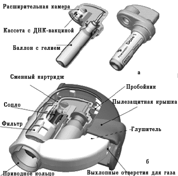 Сурет 3В. “Powderject” компанияның бірреттік генді пистолеті (а –сыртқы көрінісі, б – кесіндіде)