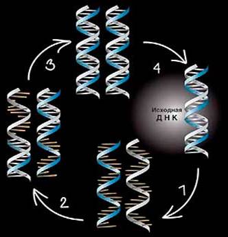 Сурет 6. Полимеразалық тізбекті реакция әдісі(ПТР), шектеусіз санда нуклеин қышқылдарын «көбейту» қабілеті биологияда шынайы революция жасады. Әдістің мақсаты қарапайым: қыздырғанда ДНҚ спиралі ажыратылады, ал кейін арнайы фермент көмегімен әр тізбекке олардың комплементарлығын тізеді. Нәтижесінде бір екі тізбекті ДНҚ-дан екеуі пайда болады. Екеуден – төртеу және әрі қарай көшірмелер көбейе береді. Бұл процесті шектеусіз қайталай беруге болады!