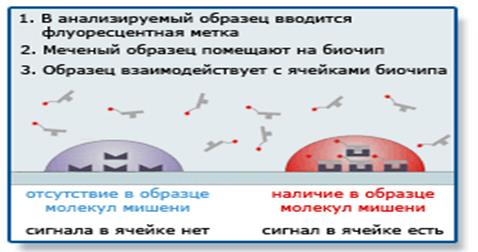 Биочиптер адамның аурулар диагностикасының жаңа технологиясы ретінде негізінен «бұрыңғы» жақсы белгілі азотты негіздердің комплементарлық принципі (ДНҚ-чиптер) немесе антиген мен антидененің қарым-қатынас механизмі бойынша (нәруыздық чиптер), немесе фермент(тер)тің субстратпен дара немесе клетка құрамындағы арнайы реакцияларына (ферментті және клеткалық сенсорлар) негізделген. ДНҚ бір молекуласымен, бір ғана спецификасы бар антиденемен немесе бір ферментпен орындалатын ПТР, ИФА және фермент-субстратты реакциялардан биочиптері бар диагностикалық тесттердің айырмашылығы – олар бір мезгілде жүздеген және мыңдаған олигонуклеотидтер молекулаларымен жүргізілетін реакциялар сериясы, осындай микрореакциялар көлемі 20 микрон ұяшықтарда өтеді (биочип бетінде осындай ұяшықтар жүзден бірнеше мыңға дейін болуы мүмкін). Комплементарлы олигонуклеотидтердің гибридизациясы, антиген-антидене комплексі түзілуі, субстрат пен ферменттер байланысының биохимиялық реакциялар қорытындыларын флюоресцентті таңбалау, электростаттық шығару (тебу) күшін, электроток өткізштігін, масс-спектрометрия (зонд затының молекулалық массасы жоғарлауы бойынша) және т.б. көмегімен анықталынады. Осы мақсатта арнайы автоматтандырылған анализаторлар – биочип-детекторлар ойластырылған.