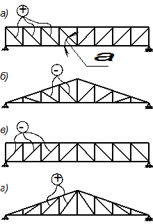 Для зменшення вдвічі довжини панелі верхнього стиснутого поясу в трикутну решітку додатково вводяться стояки (рис. 8.13). Вони отримуються достатньо легкими, оскільки працюють лише на місцеве навантаження, тобто сприймають лише ту силу, яка прикладається безпосередньо у вузол стояка, і не приймають участі в передачі на опору поперечної сили. Це найбільш розповсюджена решітка. Якщо зосереджене навантаження прикладається і до нижнього поясу (підвісна стеля, підвісне підйомно-транспортне устаткування, тощо), то вводяться в решітку додаткові підвіски, у вузли примикання яких і прикладаються ці сили. Використання підвісок дещо ускладнює решітку, обтяжуючи її, внаслідок чого трикутна решітка може втратити свої переваги.