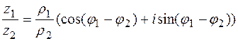 При делении двух комплексных чисел заданных в тригонометрической или показательной формах их модули делятся, а аргументы вычитаются: