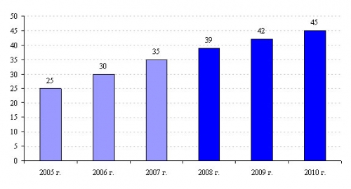 Сурет 48. 2005-2010 жылдары дүние жүзінде антимикробты препараттарды сату болжамы (млрд. долл.). Ақпарат көзі – Arrjwhead Publishers есебі, 2007 жылдың тамыз айы.