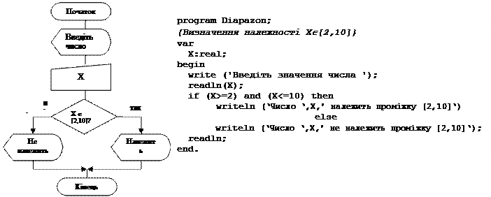 Приклад 1. Розробити програму визначення, чи належить задане число проміжку [2,10].
