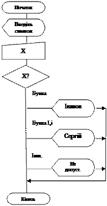 Приклад 3. Розробити програму, яка виконує наступні дії: для введеного символу видати відповідне сповіщення: при введенні „П” вивести своє прізвище, при введенні „І” – ім’я, при введенні іншого символу видати сповіщення „Символ не оброблюється”.