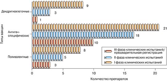 Жүздеген вакциналар клиникалық сынақтан өтуде, ең алдымен аллогенді вакциналар және 20-25% - аутологиялық вакциналар құрайды, яғни егілген науқастан алынған өспелер антигендері негізінде дайындалған препараттар. Спецификасына байланысты екі вакцина типтерін (аллогенді және аутологиялық) антиген-спецификалық, поливалентті және дендритті-клеткалық түрлеріне бөледі. Антиген-спецификалық вакциналар дербес таңдамалы әсер етуі кеңірек. Сүт безі обырына, простата обыры, тоқ ішек пен өкпе өспелеріне қарсы вакциналар өндірілуі аса тиімді келешегі бар. Бүйректің меланомасы мен карциномасына қарсы вакциналар өндірілуіне жоғары назар аударылады, себебі осындай ісіктер иммунотерапияға жақсы көндігеді (кесте 19, сур. 59).