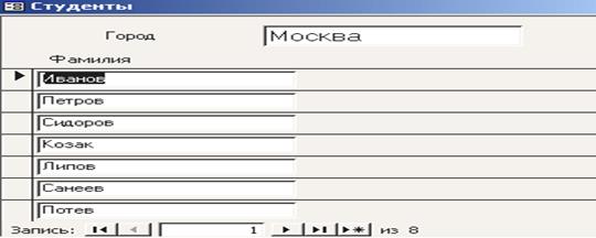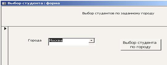 Пример 2. Имеется форма “Выбор студента” с полем со списком, где даны города (рис.2.1). Имеется форма "Студенты”, где даны города и фамилии студентов (рис.2.2.) В форме “Выбор студента” имеется кнопка “Выбор студента по городу”.В поле со списком выбирается город, и, нажав на кнопку, выбираются только те студенты, кто живет в данном городе. Ниже приведена простейшая процедура для кнопки.