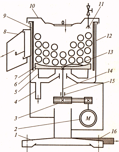 | Рис 3.2 Машина для чищення картоплі МОК – 150 (МОК – 300) 1 – станина; 2 – електродвигун; 3 - клинопасова передача; 4 – зливний патрубок; 5 – лопаті; 6 – металевий диск; 7 – абразивний диск; 8 – розвантажувальний люк; 9 - металічний циліндр з отворами; 10 - завантажувальний отвір; 11 – ніпель; 12 – робоча камера; 13 – хвиля; 14 – вертикальний вал; 15 – підшипник; 16 – зливний шланг |