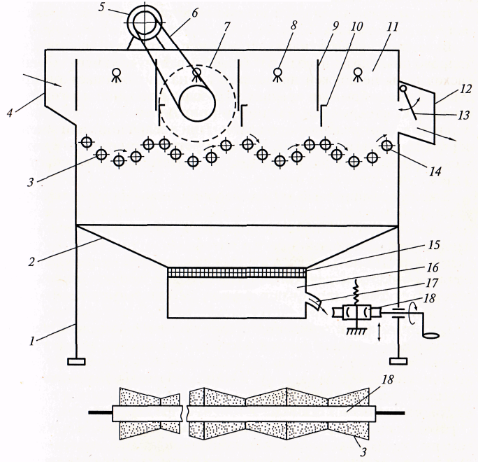 | Рис. 3.5 Принципова схема картоплеочисної машини КНА – 600М 1 – рама; 2 – ванна; 3 – ролик; 4 – завантажувальний отвір; 5 - електродвигун; 6 – клинопасова передача; 7 – циліндричне колесо; 8 – колектор; 9 – перегородка; 10 – заслінка; 11 – секція робочої камера; 12 – розвантажувальний люк; 13 – поворотна заслінка; 14 – валок; 15 – сітка; 16 – відстійник для крохмалю; 17 – зливний патрубок; 18 – регулювальний механізм |