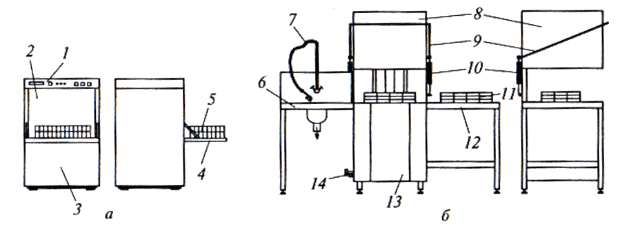 | Рис. 5.4 Машини для миття посуду періодичної дії а – фронтальна; б – купольна; 1 – панель керування; 2 – камера; 3, 13 – основа; 4 – дверцята; 5, 11 – касета; 6 – завантажувальний стіл; 7 – розбризкувальний пристрій; 8 – купол; 9 – важіль; 10 – підйомний механізм; 12 – розвантажувальний стіл; 14 – трубопровід |