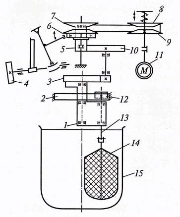 | Рис. 6.4 Кінематична схема збивальної машини МВ-35М 1 – водило; 2 – нерухоме зубчате колесо; 3, 5, 10 – зубчаті колеса; 4 – маховик; 6, 7 – нижній і верхній конусні диски веденого шківа; 11 – двигун; 12 – шестерня-сателіт; 13 – робочий вал; 14 – збивач; 15 - бачок |