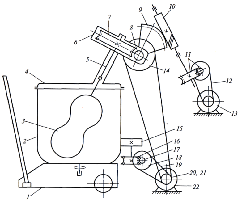 | Рис. 6.6 Тістомісильна машина МБТМ-140 1 – візок; 2 – діжа; 3 – робочий орган; 4 – кришка; 5 – робочий вал; 6 - корпус траверси; 7, 16 – черв'ячне колесо; 8, 10, 17 – черв'як; 9 – черв'ячний сектор; 11 – черв'ячна передача; 12 – клинопасова передача; 13 - реверсивний електродвигун; 14, 18, 20, 21 – шківи; 15 – фрикційне колесо; 19 – клиновий пас; 22 – електродвигун |
