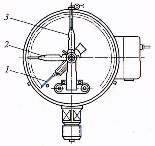 | Рис. 7.6 Електроконтактний манометр 1,3 – нерухомі стрілки для встановлення нижньої та верхньої межі тиску; 2 – рухома вказівна стрілка |