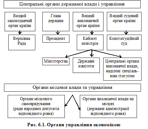 Для управління економікою країни утворюються відповідні центральні та місцеві органи управління економікою (див. рис. 6.1).