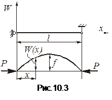 Покладемо, що при значенні Р≈Ркр (трошки більше) стержень з шарнірно закріпленими кінцями згубить стійкість (рис.10.3). При цьому будемо вважати, що сила Р≈Ркр не викликає у стержні напружень, які перевищують границю пропорційності і величини прогину не великі, тобто: sкр ≤sпц.