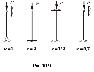 Ця формула носить назву, формули Ейлера. Значення n для різних випадків закріплення стержнів. (рис. 10.9).