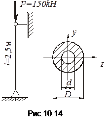 1. Перевірити на стійкість стиснуту сталеву стійку трубчатого перерізу з sпц=540 МПа, Е = 2,15 105МПа, потрібний коефіцієнт запасу стійкості nу = 3,5 (рис. 10.14).