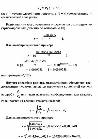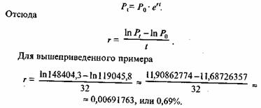 Данное выражение не учитывает, однако, что население меняет свою численность непрерывно, а не подобно банковскому депозиту, когда процент начисляют в конце каждого периода. Чтобы учесть эффект непрерывности, для расчета среднегодо-