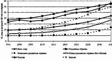 Динамика старения населения мира и отдельных регионов, 1995-2050 гг.