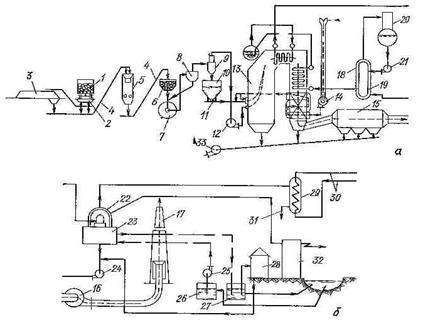Шлак і зола, що випадають під топочною камерою, підігрівачем повітря і золозадержувачами, змиваються водою і по каналах поступають до багерних насосів 33, які перекачують їх на золовідвали.