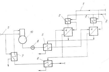 1-підвод гріючої пари; 2-відвод вторинної пари; 3-пароперегрівач; 4- пароперетворювач; 5-охолоджувач конденсату; 6-охолоджувач продувки; 7-підігрівач живильної води пароперетворювачів; 8-живильний насос; 9-підвод пару до підігрівача та деаератора; 10-деаератор.