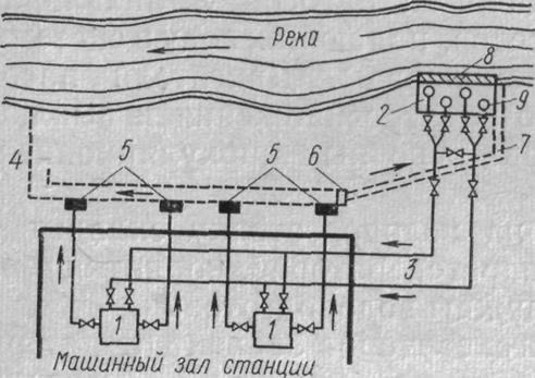 1 — конденсатори; 2 — берегова насосна: 3 — напірні магістралі; 4— відвідний канал; 5 — сифонові колодязі; 6 — перемикаючий колодязь; 7— перепускний канал; 8 — сітки; 9 — циркуляційні насоси.