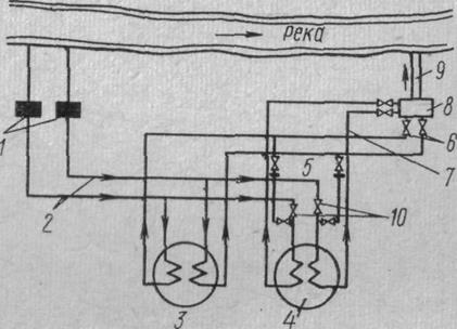 1 — берегова насосна; 2— напірні магістралі: 3 — перший конденсатор; 4 — другий конденсатор; 5 — циркуляційний насос; 6 — скидання води від першого конденсатора; 7—скидання води від другого конденсатора; 8— сифоновий колодязь; 9 — відвідний канал; 10 — засувки, що забезпечують роботу другого конденсатора на свіжій воді.