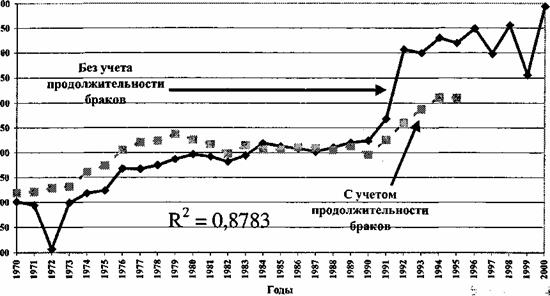 С другой стороны, известно, что во второй половине 60-х гг. в СССР наблюдался резкий скачок числа разводов и разводи-мости: если в 1965 г. абсолютное число разводов и общий коэффициент разводимости были равны соответственно 360,7 тысячи и 1,6%о,то в 1966г. - уже 646,1 тысячии2,6%о, т.е. произошло почти удвоение этих показателей. Аналогичную динамику показали и приведенные числа разводов: они увеличились за эти два года с 161 до 290%о43. Так не бывает в «нормальных» условиях. И действительно, причина столь резкого скачка заключается в изменении законодательства о разводе, существенно упростившем процедуру развода. После принятия в декабре 1965 г. соответствующего указа свой фактический развод оформили сотни тысяч человек, которые давно уже не жили вместе и, может быть, даже имели новые, но официально не зарегистрированные семьи.