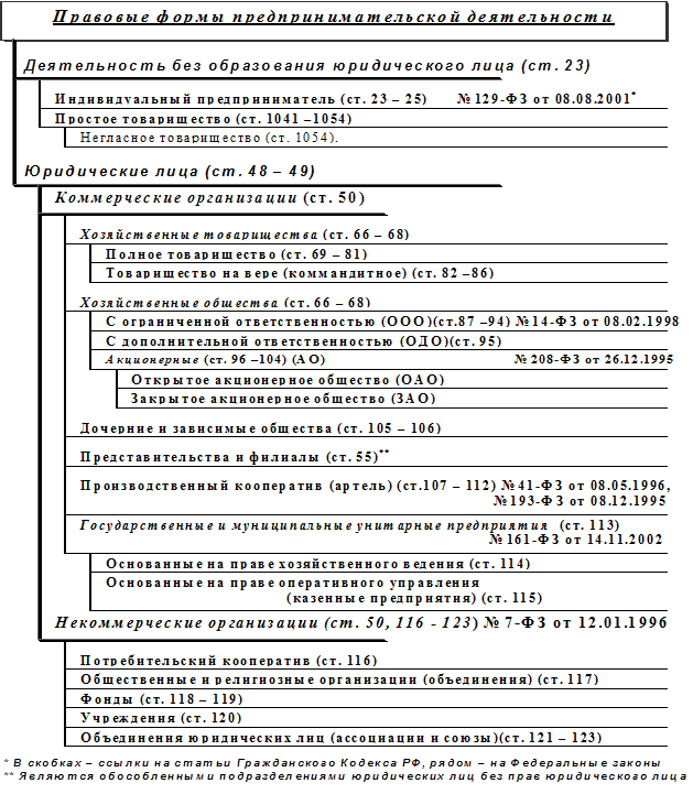 Основным содержанием деятельности предприятия является производственная деятельность, направленная на удовлетворение общественных потребностей. Взаимоотношения между участниками общественного производственного процесса регулируются гражданским законодательством, в основе которого лежит Гражданский Кодекс Российской Федерации (ГК РФ) (содержит 3 части; первая часть введена в действие 01.01.1995) и соответствующие Федеральные Законы (ФЗ), регламентирующие отдельные аспекты правоотношений. Правовые формы предпринимательской деятельности определены ГК РФ (рис. 2.5.).
