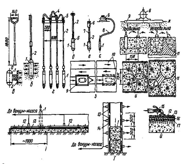 Рис. 3.12. Засоби ущільнення та схеми ущільнення і вакуумування бетонної суміші: а – шурник; б – глибинний (внутрішній) вібратор; в – зовнішній вібратор; г – пакет