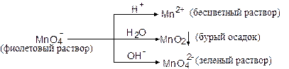 Кислотность среды влияет на изменение степеней окисления атомов, например, продукты восстановления перманганат-иона в разных средах можно представить следующей схемой:
