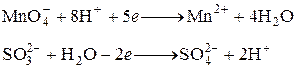 В молекулярной форме это взаимодействие описывается уравнением (с учетом одной дополнительной молекулы K2SO4 за счет двух ионов К+ из KMnO4) 2KMnO4 + 5K2SO3 + 3H2SO4 ® 2MnSO4 + 6K2SO4 + 3H2O.