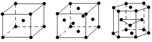 С химической точки зрения металл – это элемент, который во всех соединениях проявляет положительную степень окисления.Из известных в настоящее время 109 элементов 86 являются металлами. Основной отличительной особенностью металлов является наличие в конденсированном состоянии свободных, не связных с определенным атомом электронов. Эти электроны способны перемещаться по всему объему тела. Наличие свободных электронов определяет всю совокупность свойств металлов. В твердом состоянии большинство металлов имеет кристаллическую высокосимметричную структуру одного из типов: кубическую объемноцентрированную, кубическую гранецентрированную или гексагональную плотноупакованную (рис. 2).