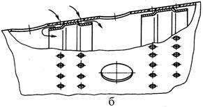 а) плёночное охлаждение с орошением; б) перфорированное охлаждение с орошением; в) конвективно-плёночное охлаждение.